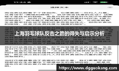 本文将深入分析上海羽毛球队在近年来的反击之路,探讨其所经历的得失与启示。通过四个方面的细致阐述,首先回顾球队的历史背景和发展历程,然后分析其在竞技水平、团队建设、心理素质以及社会支持等多个层面的表现与挑战。最后,总结这些经验教训对未来发展的指导意义,以期为其他体育团队提供借鉴与参考。 1、历史背景...